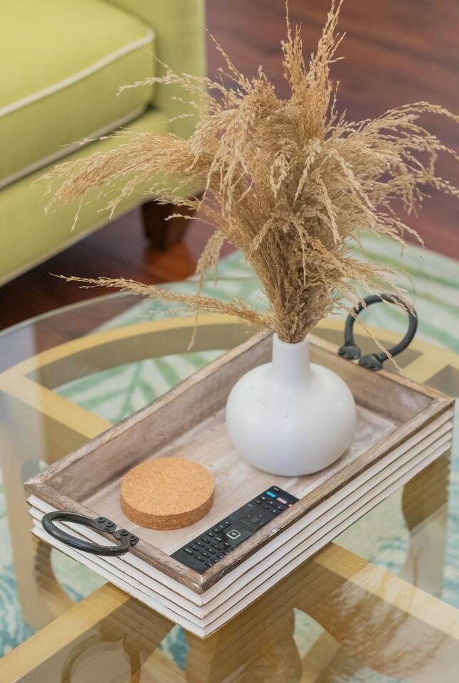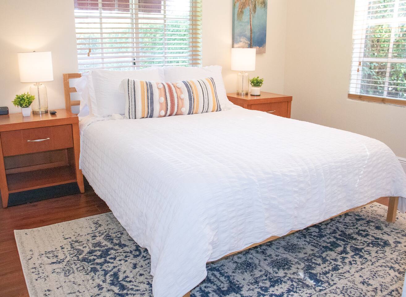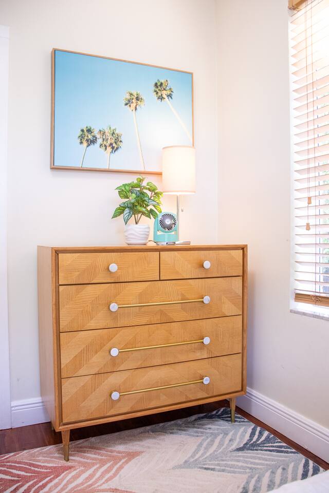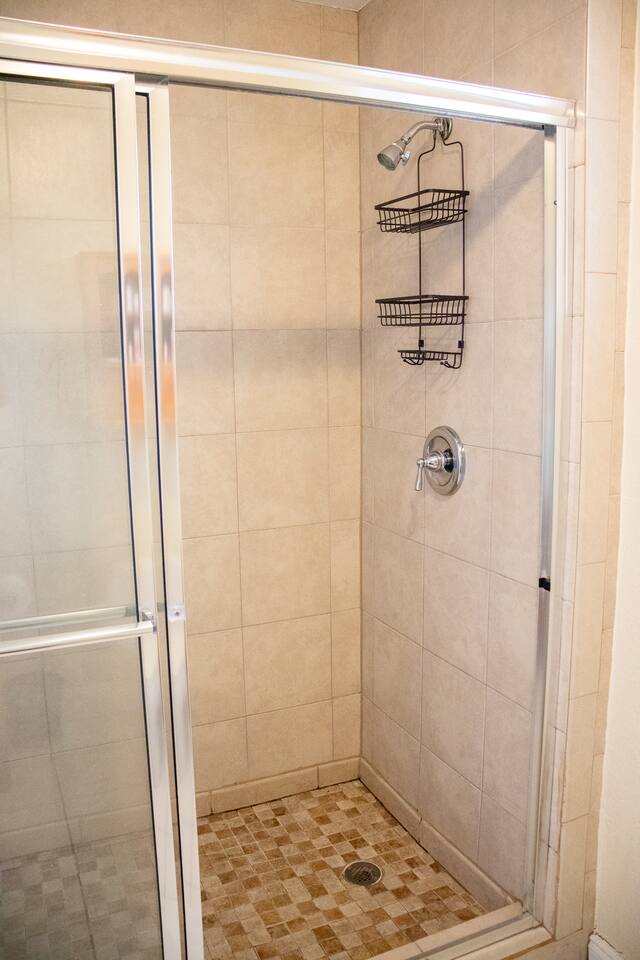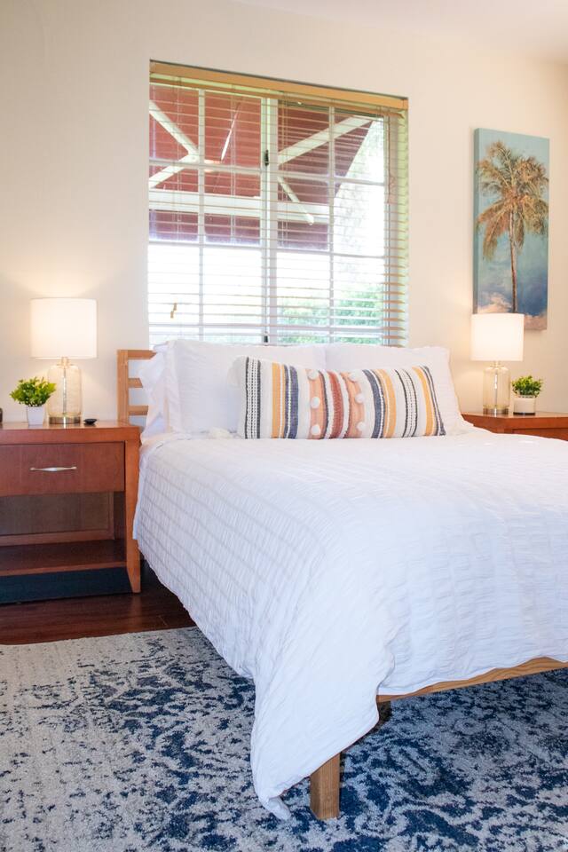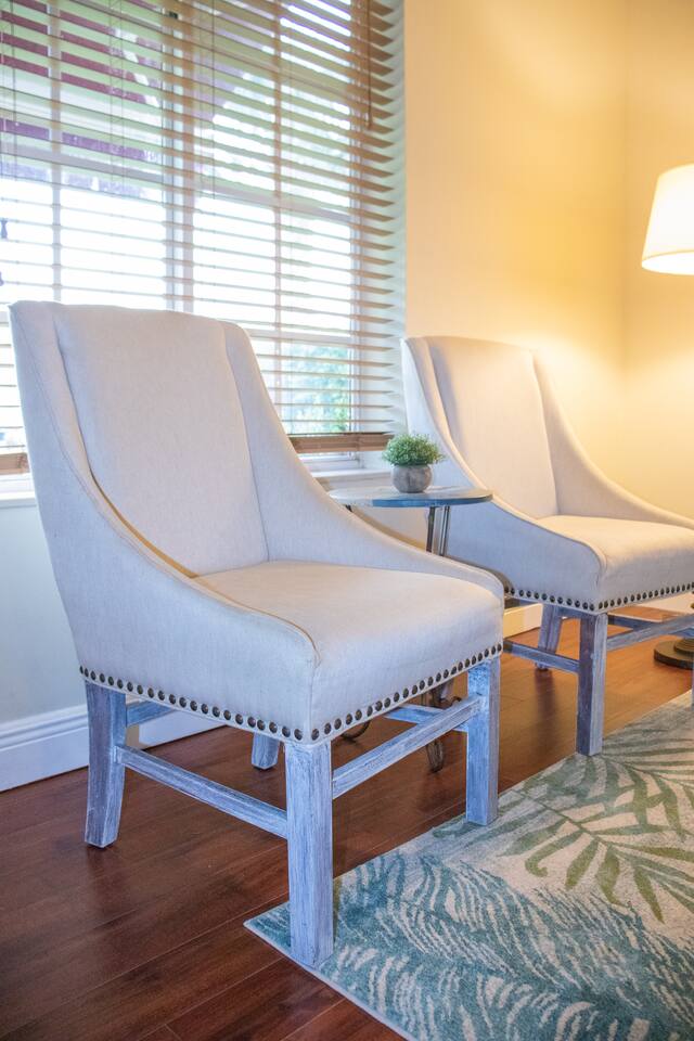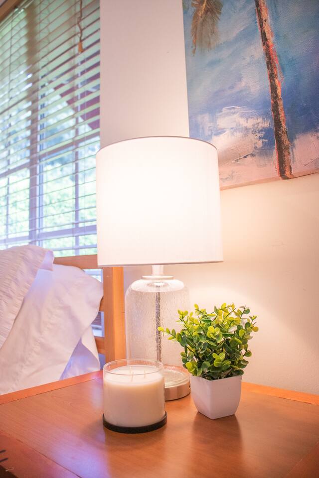 When stepping in the front door you enter the living room, next is the island that also serves as a dining table which leads you into the stocked kitchen with your basic cooking needs and also a small table with 2 chairs by the window. The bathroom has a shower with sliding glass doors, towels and washcloths provided. Bedroom 1 has a queen bed, bench and closet with hangers. Bedroom 2 has a bunk bed (full size memory foam mattress on the bottom and single on the top), dresser and a small closet with hangers. The washer and dryer is just outside the back door in a laundry room with its own entrance. Then for the back yard there is the Hot Tub, a grill, dining table and some lounge chairs