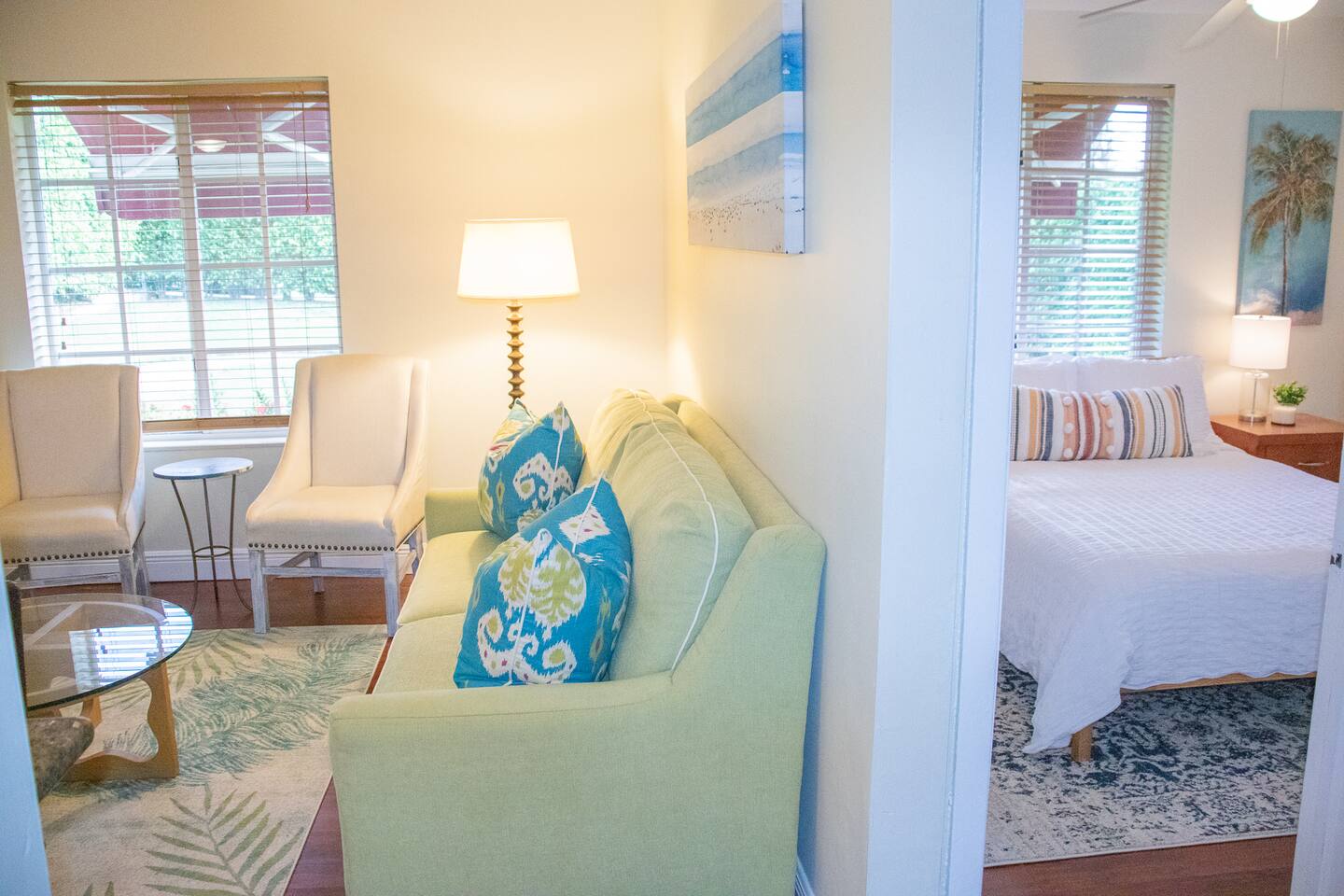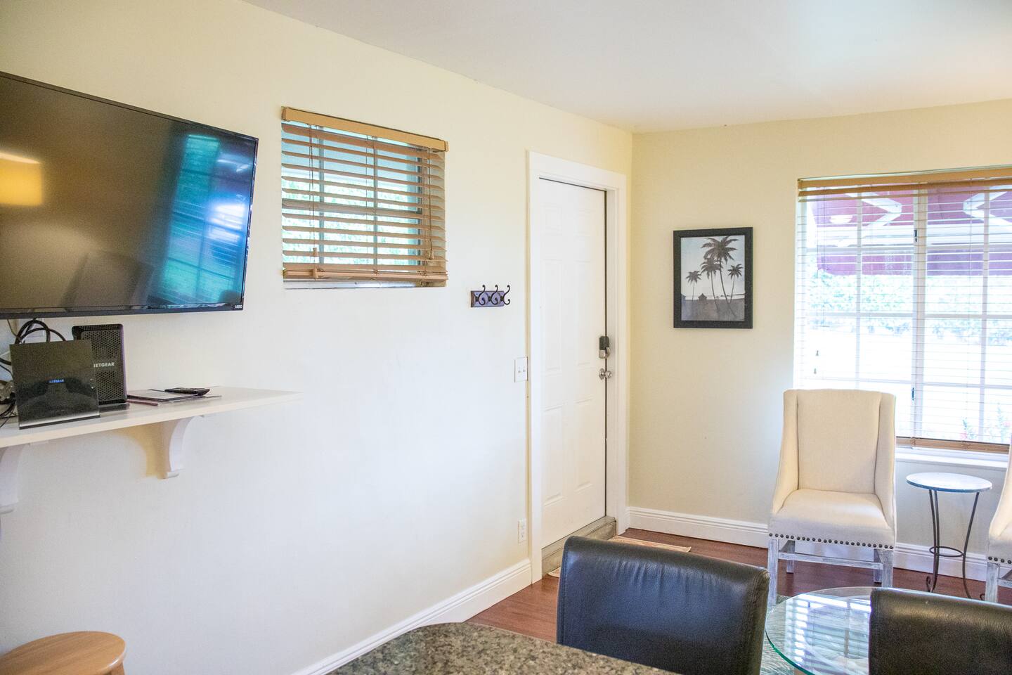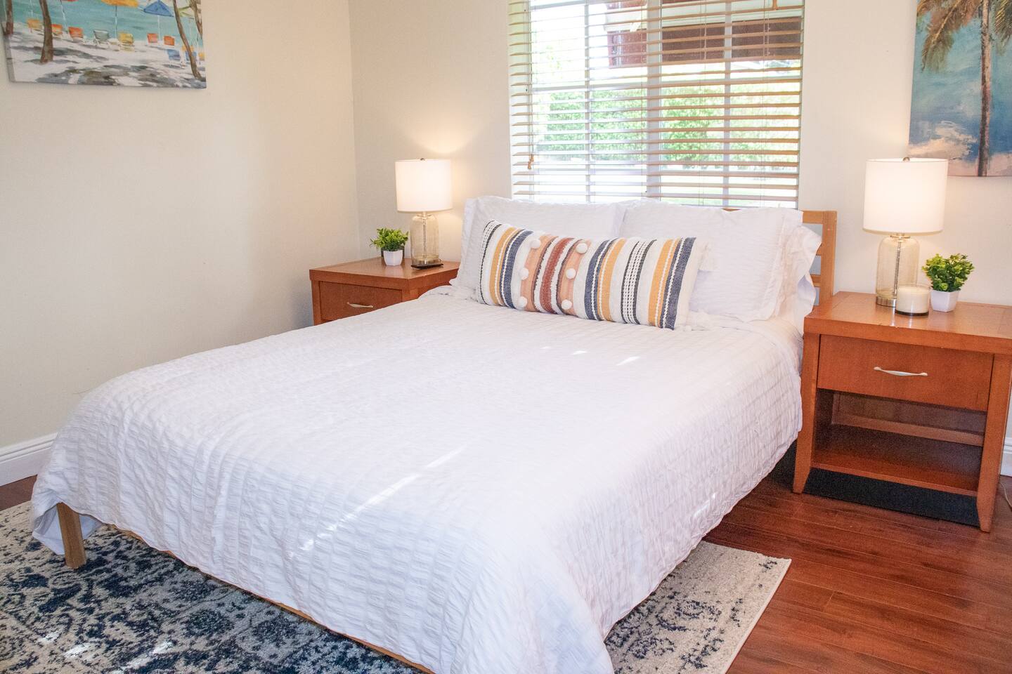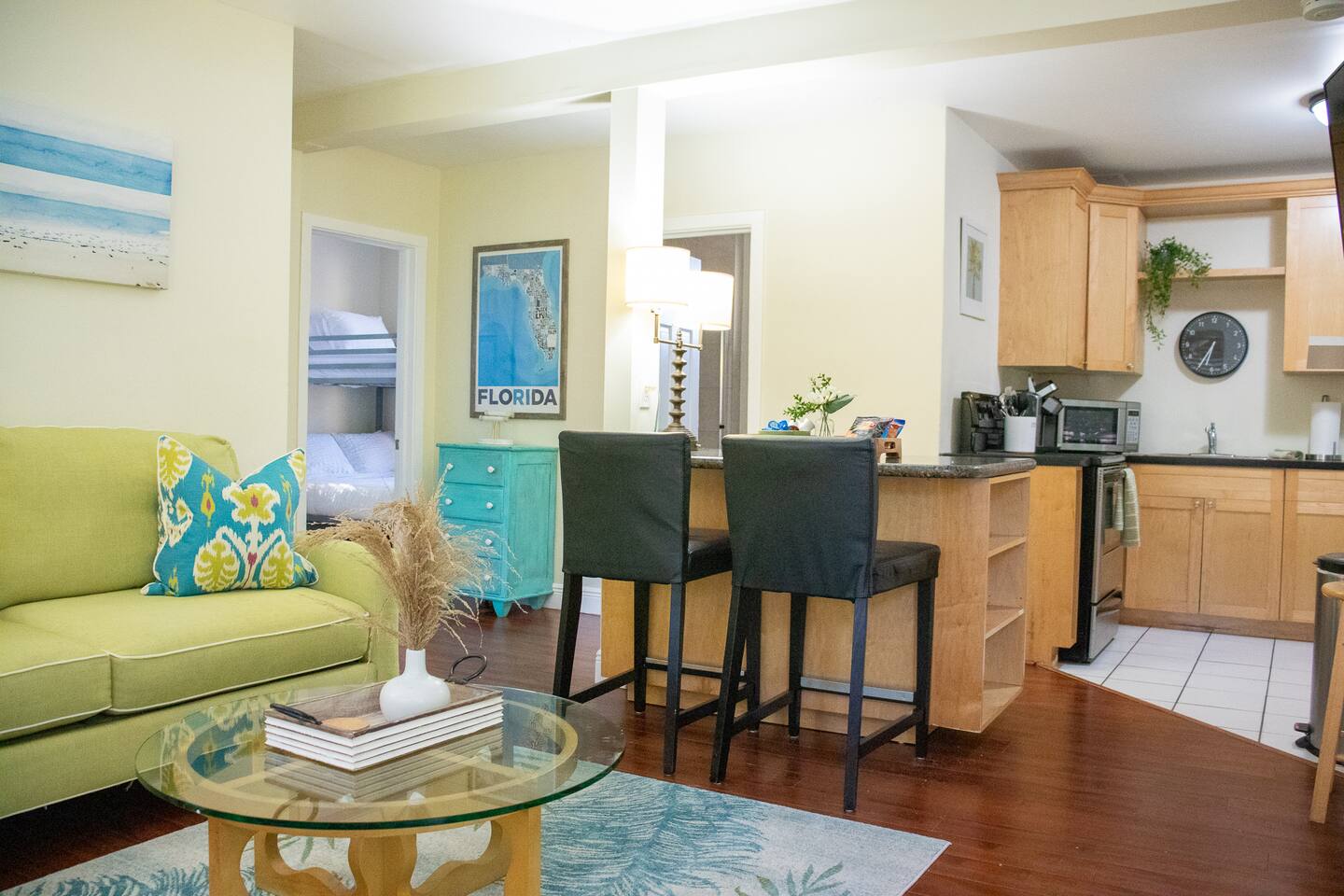 When stepping in the front door you enter the living room, next is the island that also serves as a dining table which leads you into the stocked kitchen with your basic cooking needs and also a small table with 2 chairs by the window. The bathroom has a shower with sliding glass doors, towels and washcloths provided. Bedroom 1 has a queen bed, bench and closet with hangers. Bedroom 2 has a bunk bed (full size memory foam mattress on the bottom and single on the top), dresser and a small closet with hangers. The washer and dryer is just outside the back door in a laundry room with its own entrance. Then for the back yard there is the Hot Tub, a grill, dining table and some lounge chairs